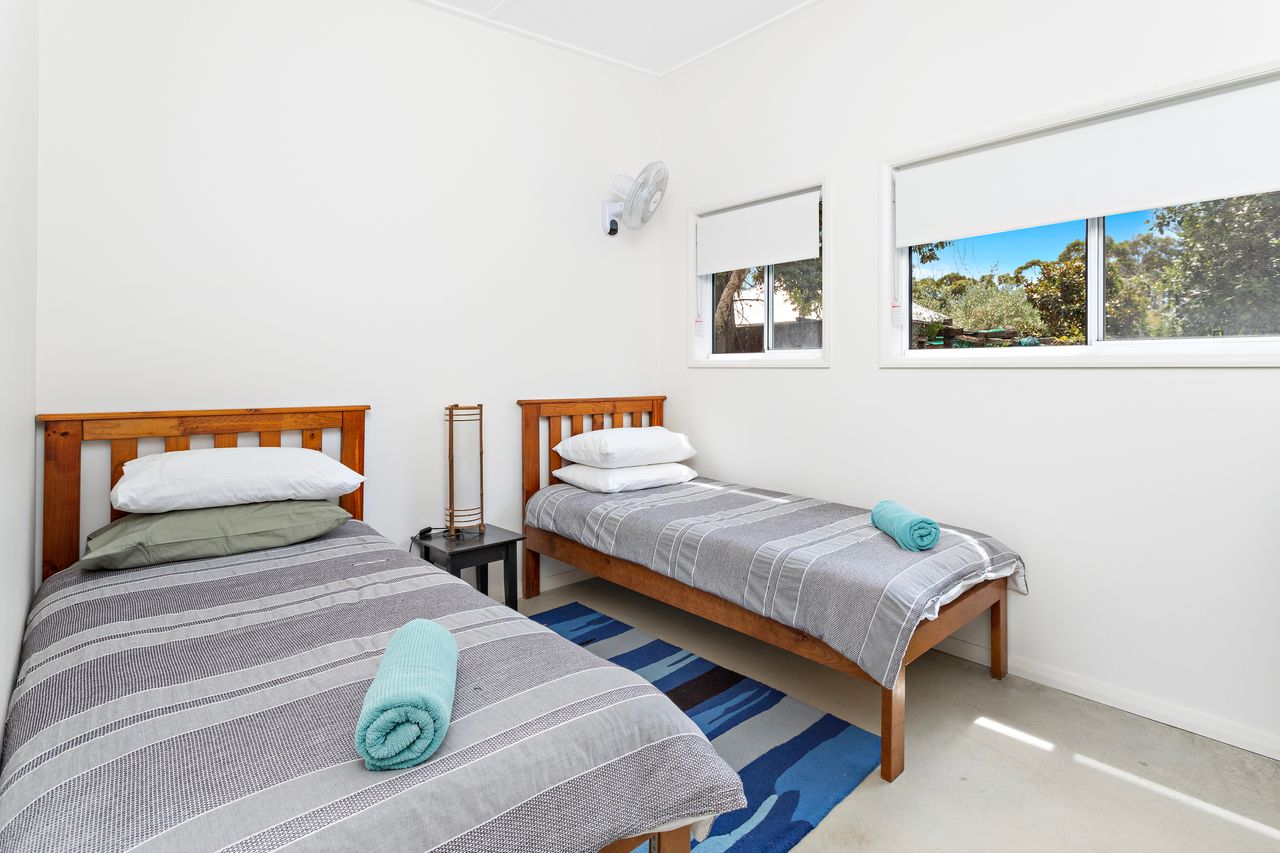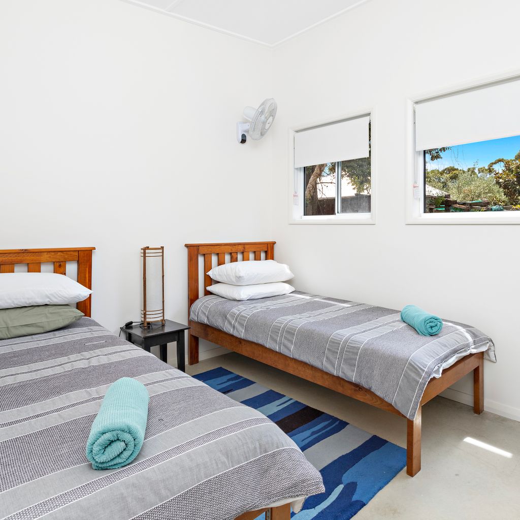 Bedroom (smaller) 2 x single beds – side table, Wall mounted fan