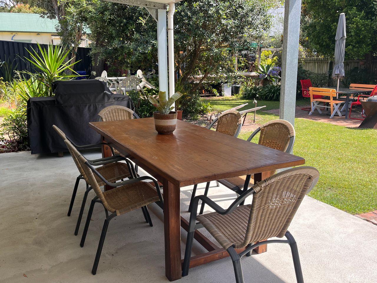 Outdoor seating – on large, covered patio overlooking the garden.
