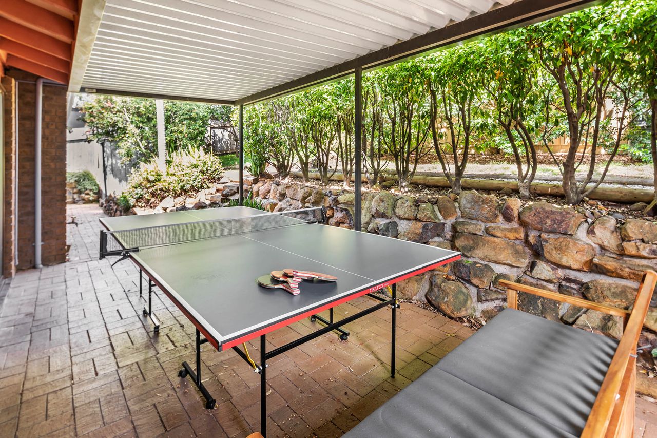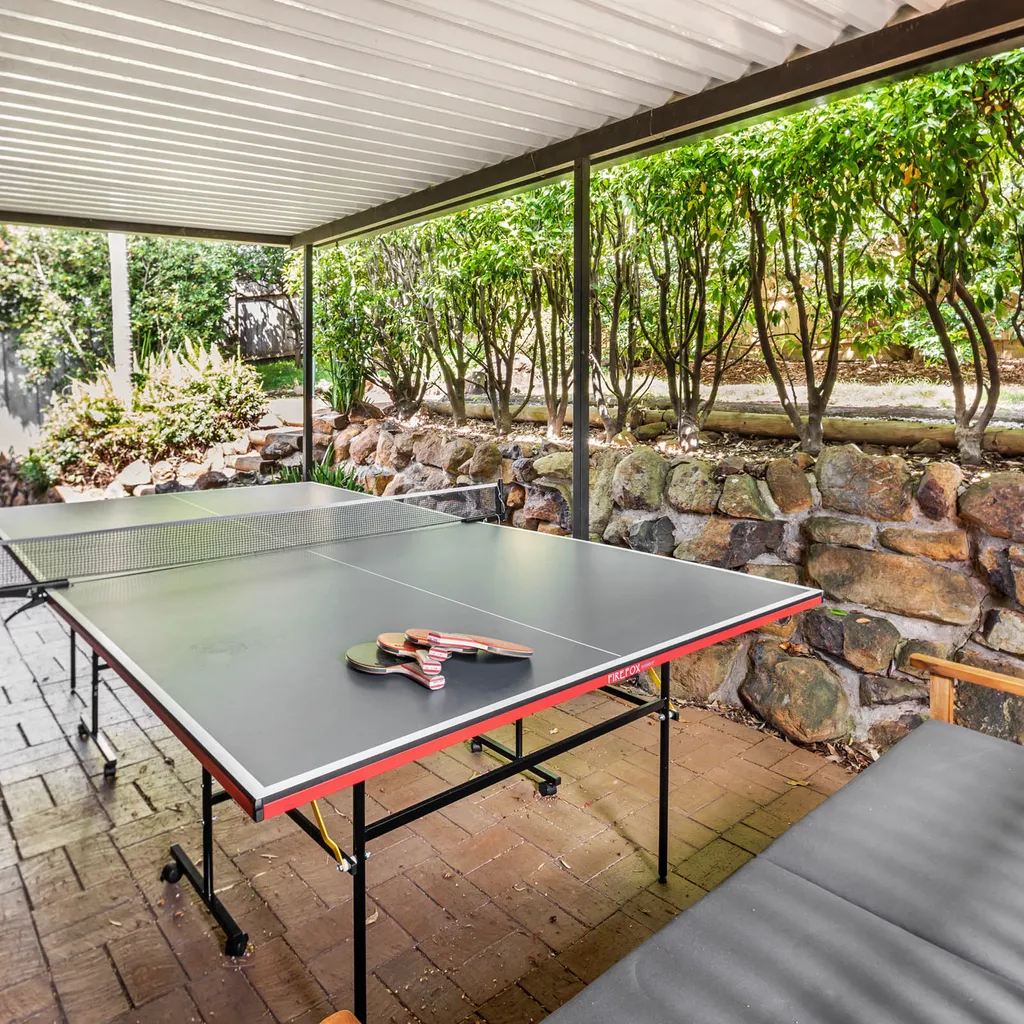 The covered courtyard at the back of the house can be accessed through the side gates or the fourth bedroom and has a ping pong table.