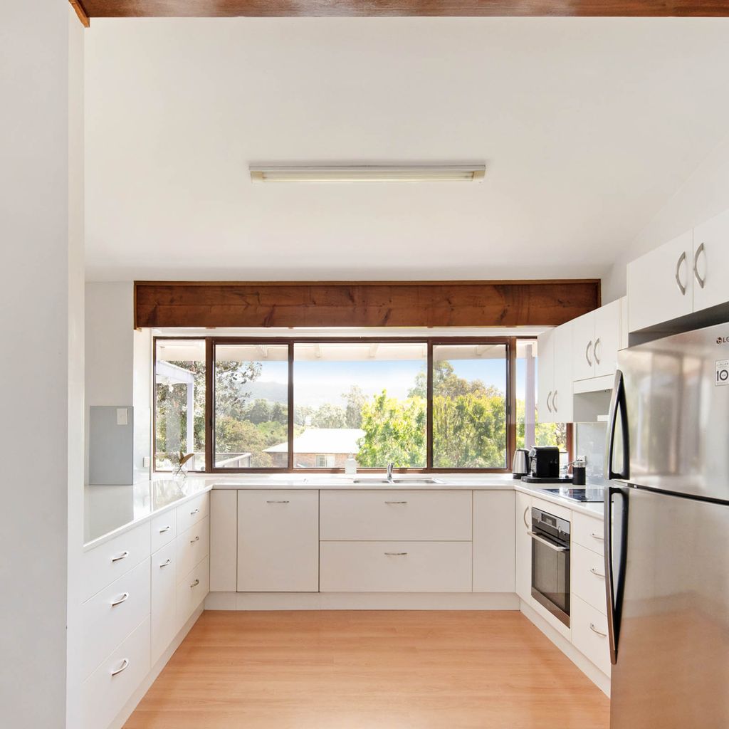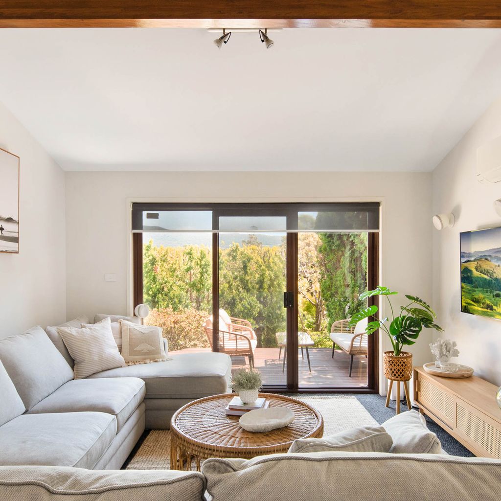 Beautifully designed and furnished; the house offers four bedrooms, a fully equipped kitchen, multiple living areas, dining, and a sun-filled deck with views of the iconic hills.
