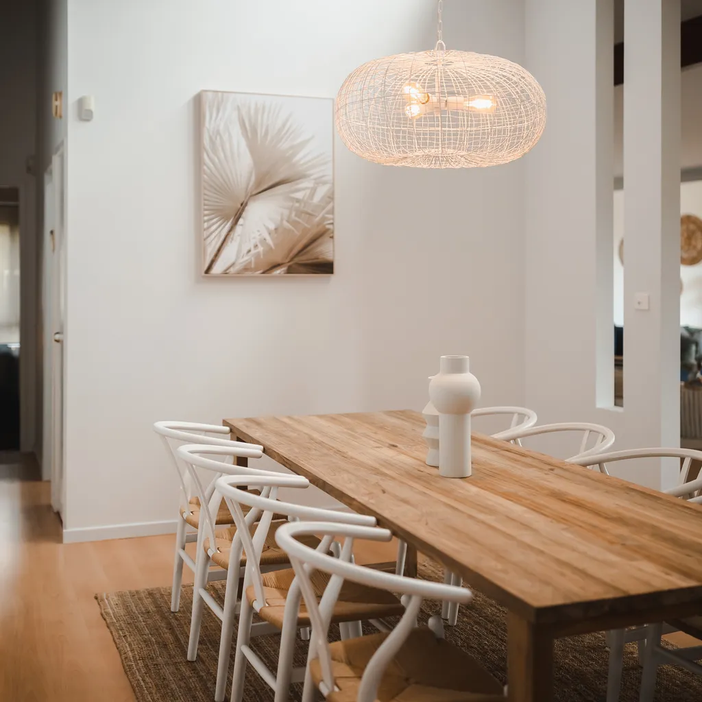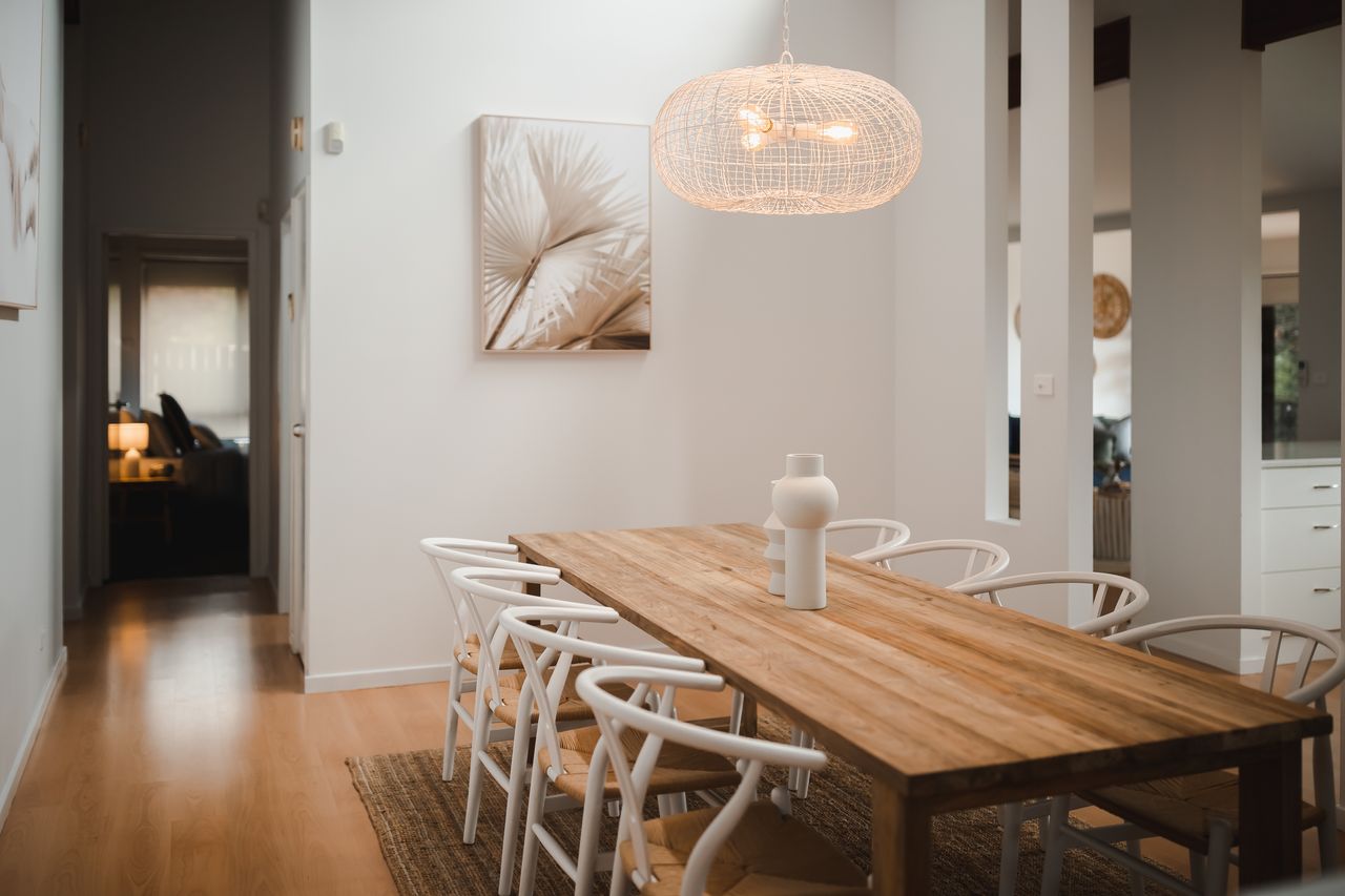 The dining area is the heart of the home and has a modern farmhouse style table that sits all eight guests.