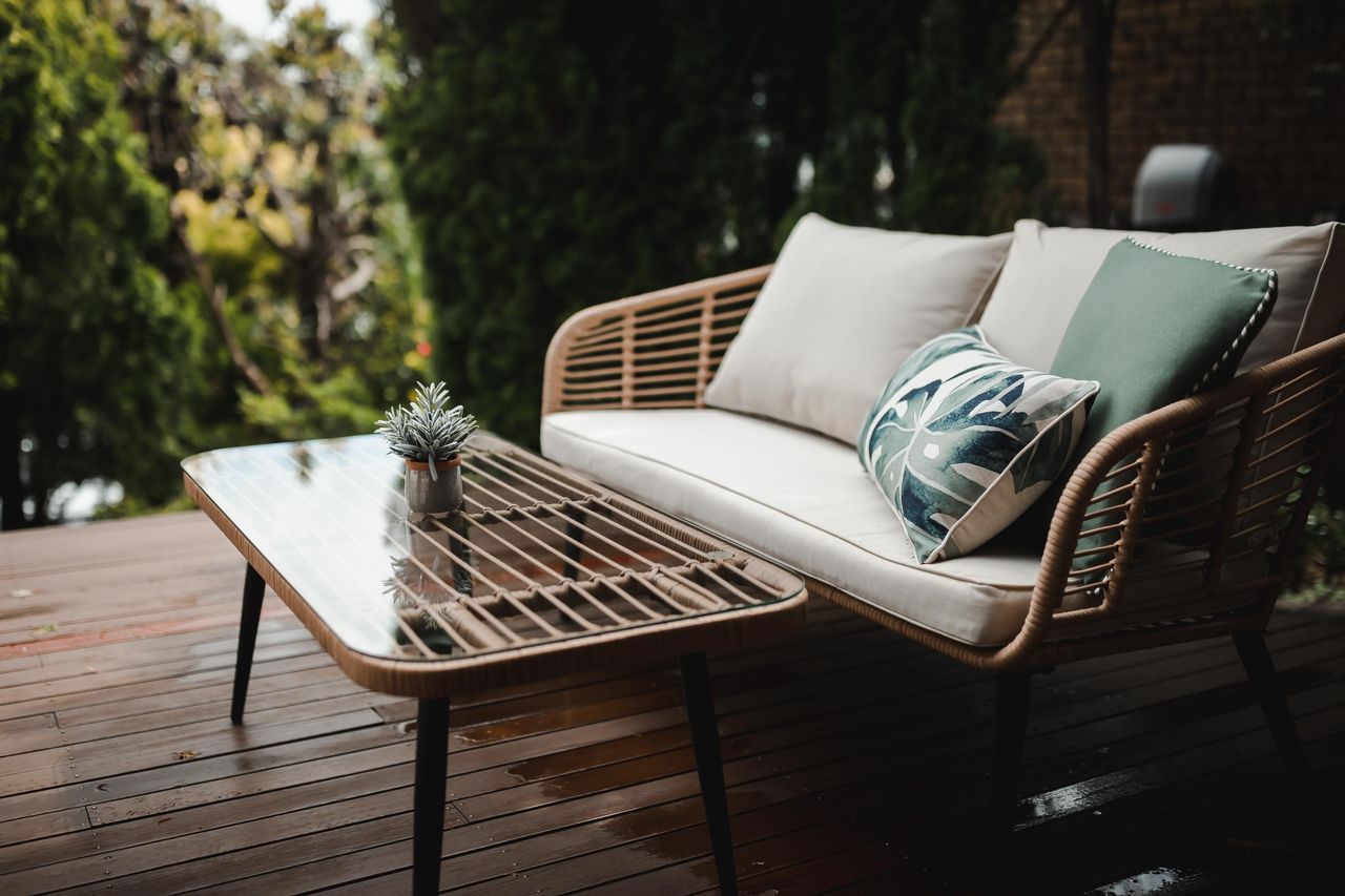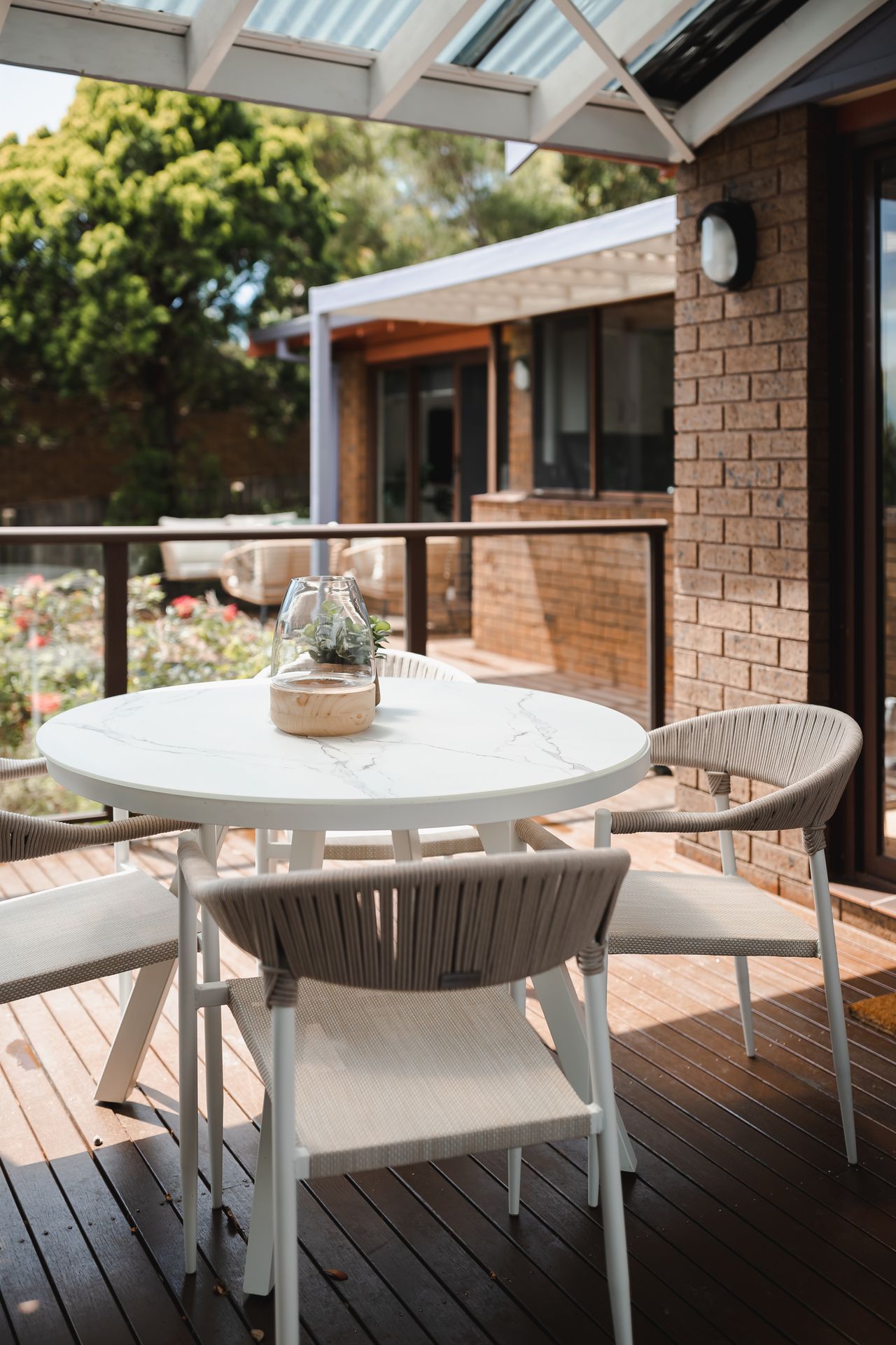 The outdoor deck is at the front of the house, behind lush gardens and overlooks the rolling hills the area is famous for.