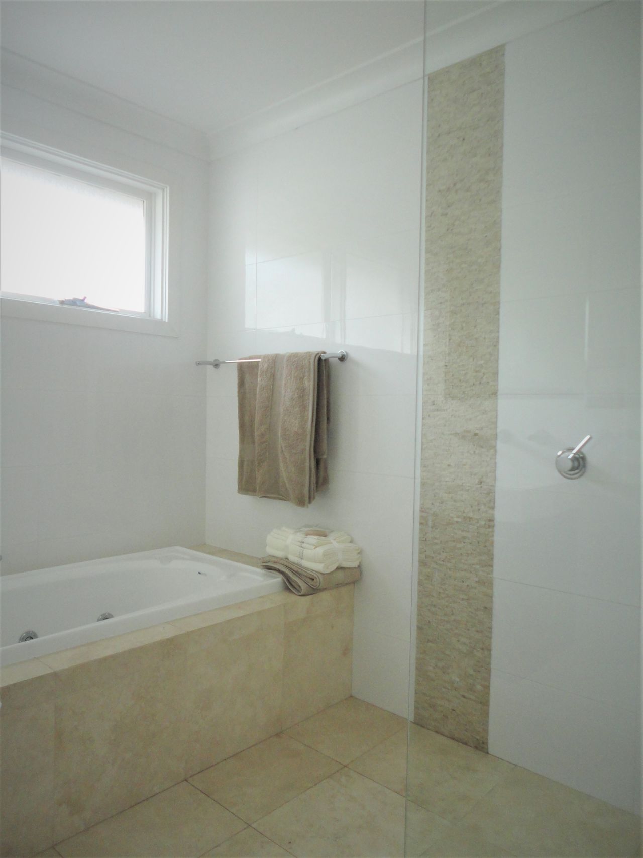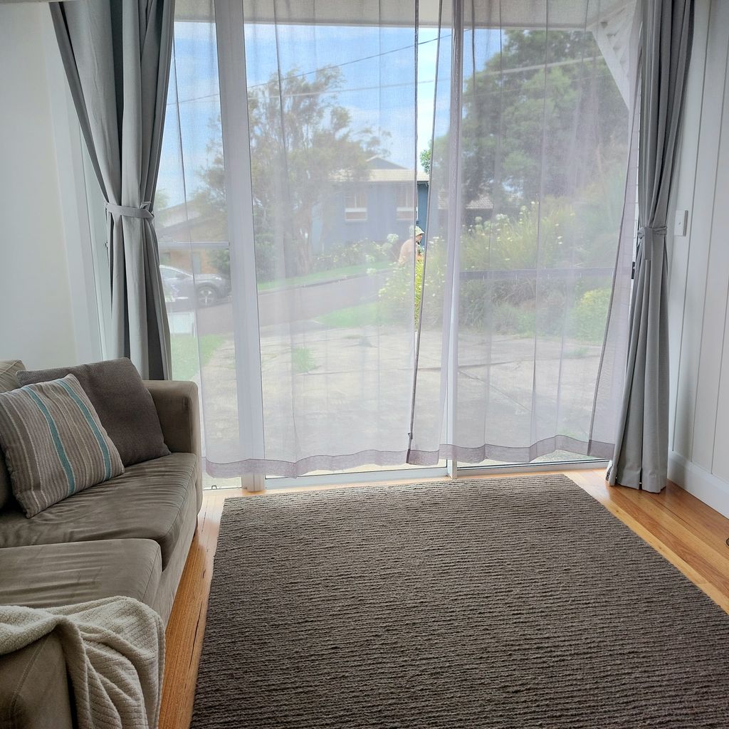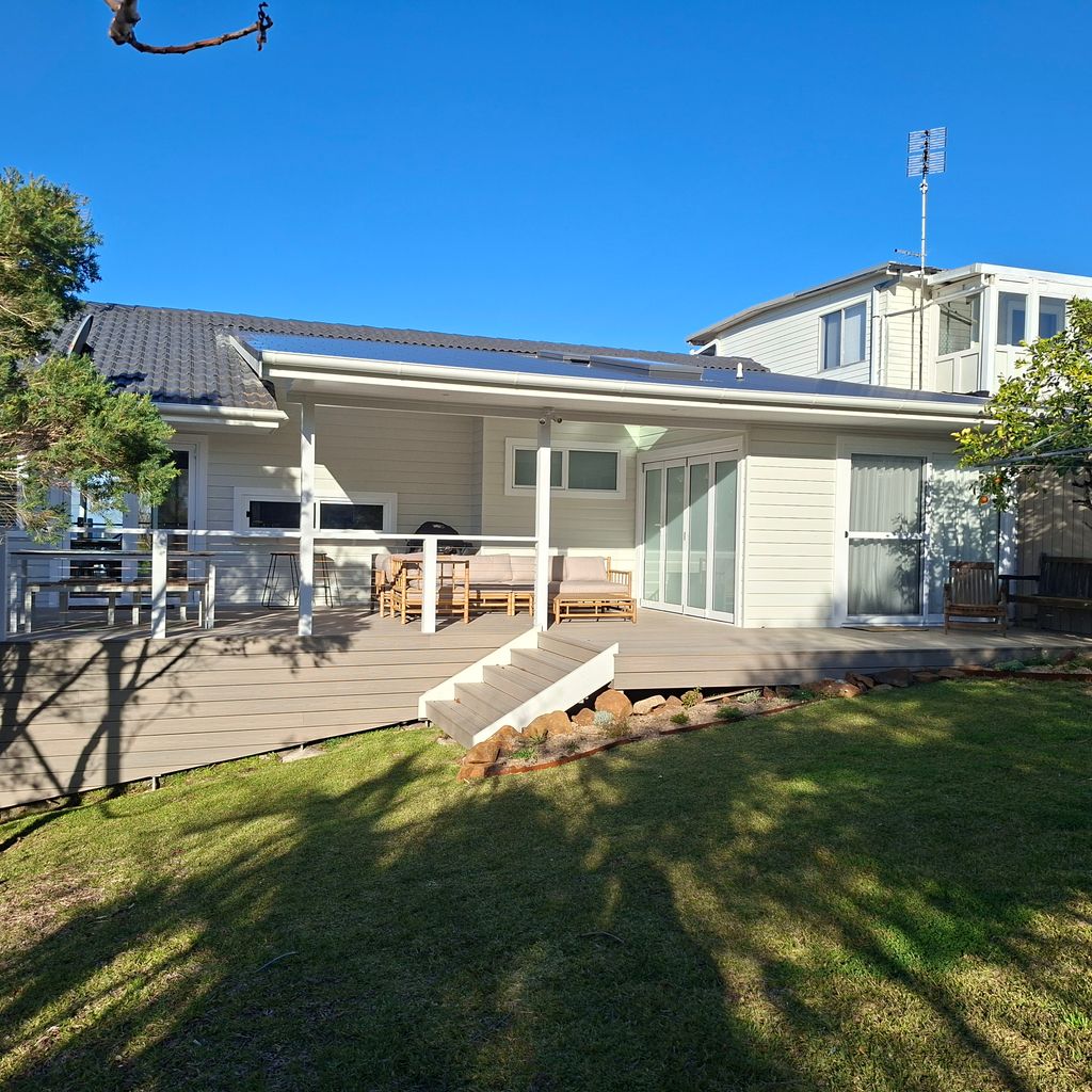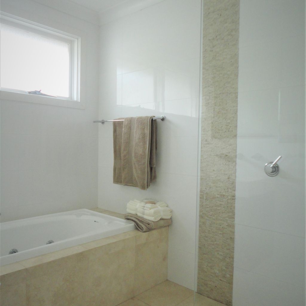 Upstairs has 2 bedrooms with 1 Queen bed to main bedroom, and a large second bedroom containing a queen bed, modular king living sofa bed/lounge and access to the rear deck and garden. Upstairs bathroom with spa bath, shower & separate toilet. Open plan living/dining area with TV & DVD player. Modern well-equipped kitchen with dishwasher, microwave, electric oven & hotplates. Split system air conditioner in upstairs living area, and ceiling fans in bedrooms. Back deck offers all year round entertaining area with outdoor dining and lounge setting, and an electric BBQ. External undercover laundry with washing machine, dryer, and drinks fridge.